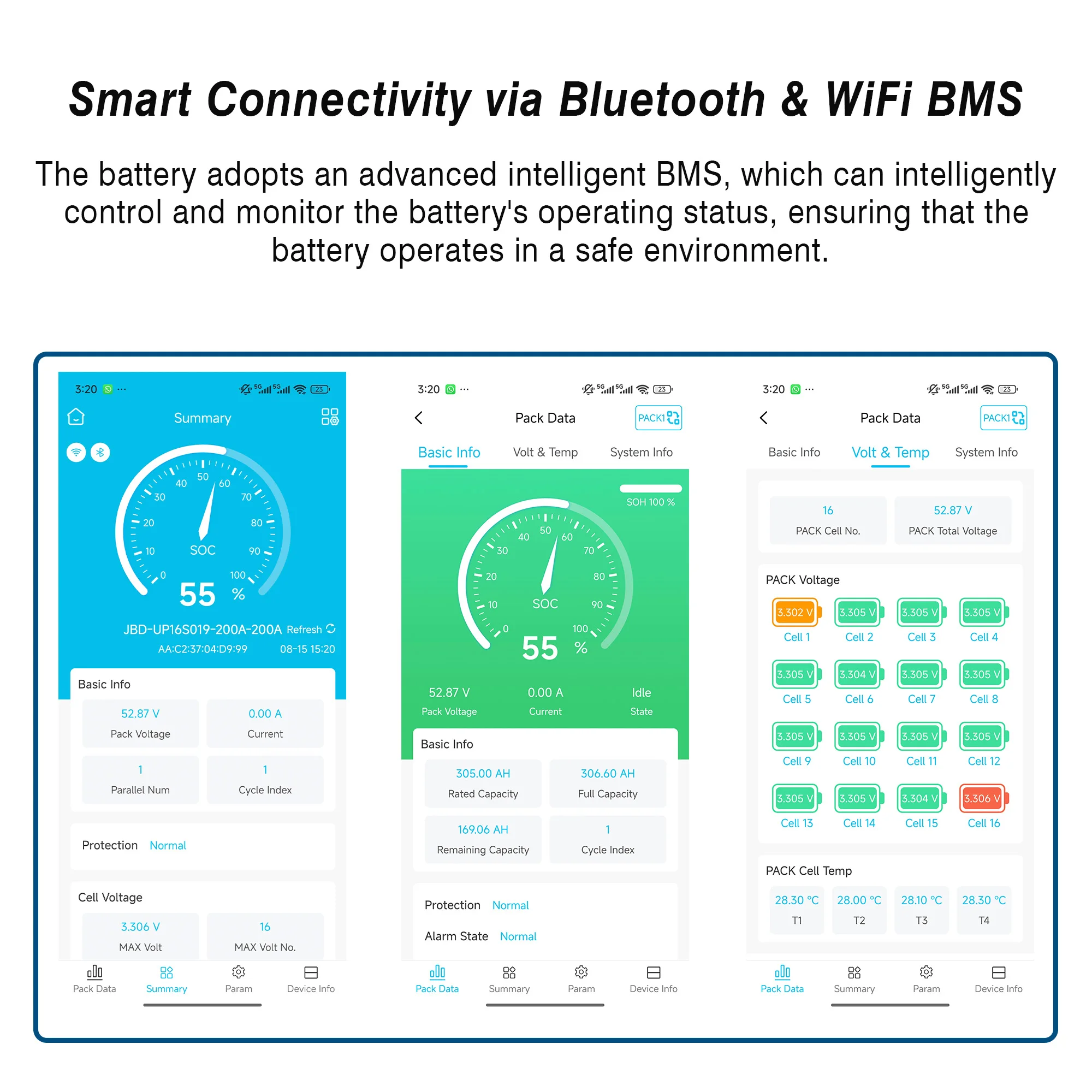 This battery pack is assembled with 16 pcs brand new 3.2V 300Ah lithium iron phosphate battery cells.
